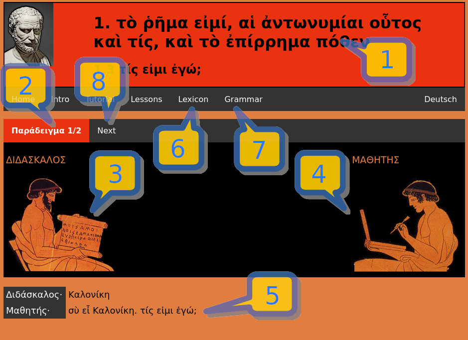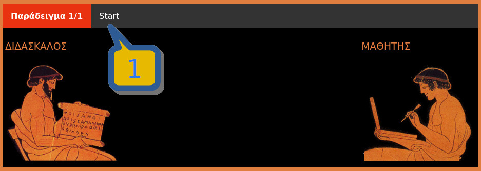 - The lesson starts with an example (Παράδειγμα). In this case, the counter "1/2" indicates that you are presently in the first of two examples.