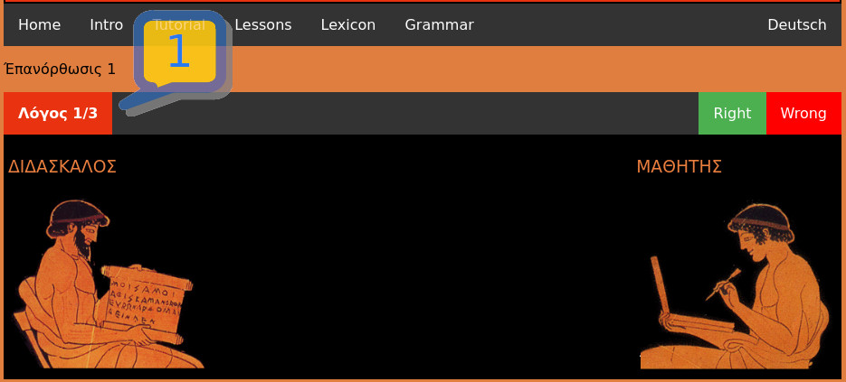 - After listening to the teacher, speak your answer aloud. Then listen to the student and check your answer. If correct, click "Right"; if incorrect, click "Wrong". Either button will take you to the next exercise, which will be indicated by the Λόγος counter.